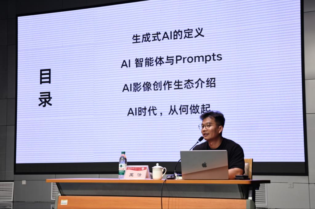 王浩老师围绕“AIGC革命:重塑影视传媒的创意与制作”主题,从生成式AI的定义、AI智能体与Prompts、Al影像创作生态介绍和AI时代下从何做起四个版块为现场师生详细解读了生成式AI的主要类型与实际应用。他以简单的基础模型和大语言模型为例,结合行业动态、自身学习经历以及AI生成视频案例的应用,生动展现了AI功能多样、应用范围广泛的特点。王浩老师全面讲解了生成式AI的驱动原理和大语言模型的基本功能,让师生深入了解了AI的基本原理和场景应用,进一步拓展了师生视野和认知。