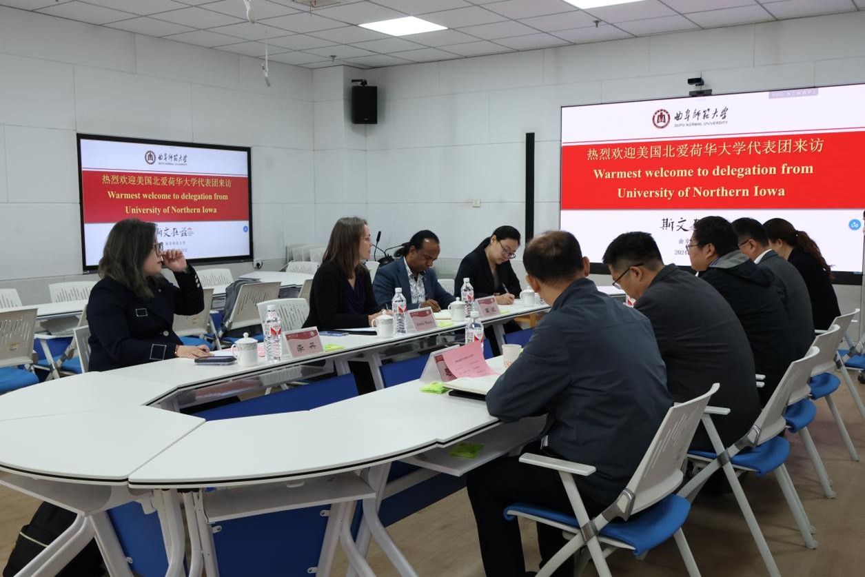 于JS434举行师生见面会,学院部分任课教师、辅导员和2022级、2023级教育技术学专业本科生参与交流。Kristin Woods校长为师生详细介绍了北爱荷华大学地理位置、师资力量、学期项目、课程安排等多方面的具体信息。我校国际交流合作处项目负责人陈晓丽对此留学项目进行了全面、具体的介绍。王焕景表示,学院将提供完备的留学支持和指导鼓励,希望学生积极关注并参与两校共同设立的各类留学项目,提前做好职业生涯发展规划。
