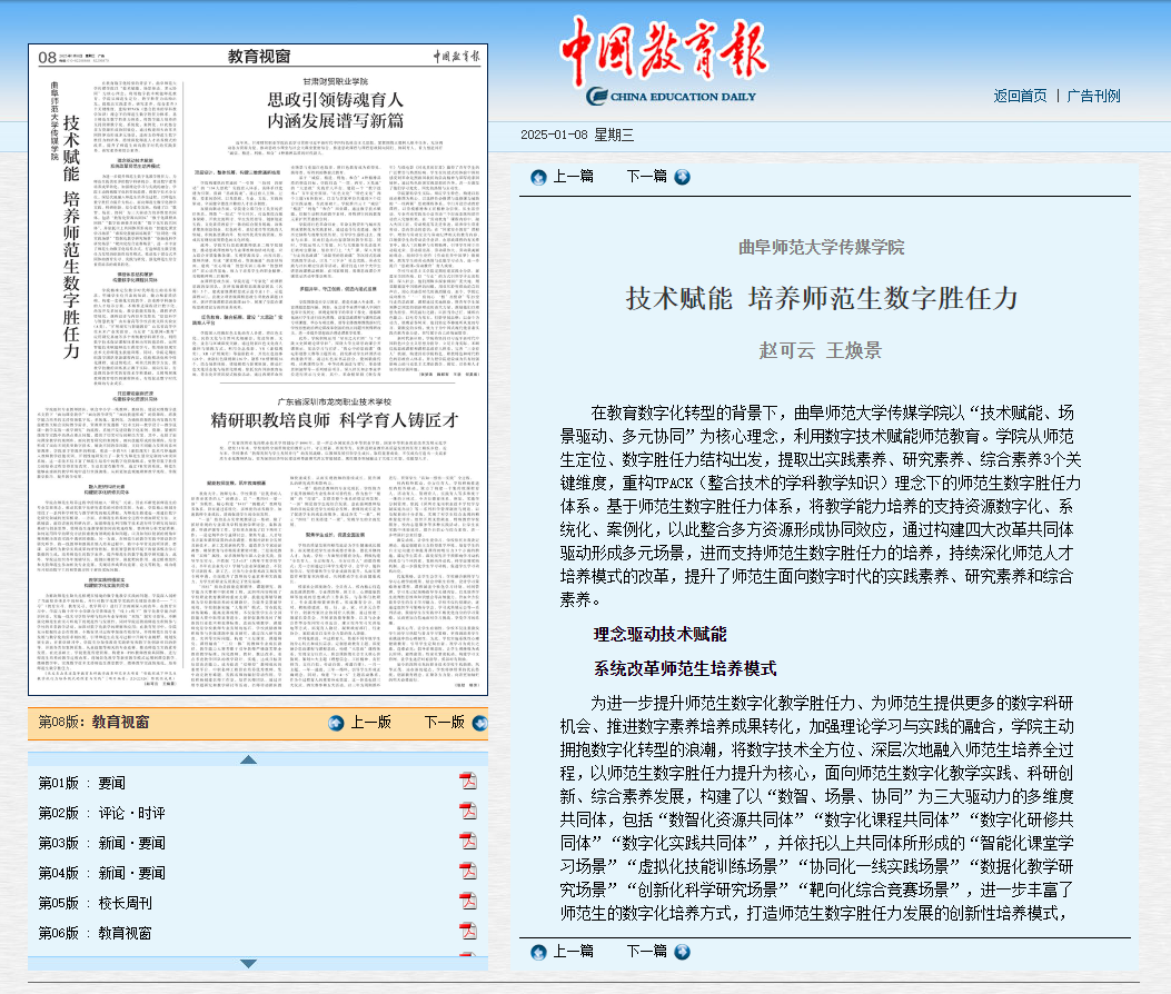 学院在师范生培养过程中持续融入“研究”元素,旨在不断更新师范生的专业发展观念,推动其数字化研究素养的可持续发展。为此,学院精心规划并增设了一系列科学研究与教学研究的相关课程,为师范生搭建起一座通往数字化研究领域的坚实桥梁。一方面,在师范生培养的全过程中增加研究方法、文献精读、前沿讲座的科研内容,加强师范生利用数字技术进行科学研究的知识基础与创新思维,使师范生逐渐掌握如何高效地收集、整理和分析文献资料,如何运用科学的研究方法探索教育领域的未知问题,以及如何以创新的视角审视和解决教育实践中遇到的难题;另一方面,在师范生的教学实践中增设教学研究环节,将一线教师和教研员纳入培养过程中,将中小学常见的听评课、磨课、说课作为教学实践成果的评价依据,依托智慧教育环境下海量多模态学习数据的生成,培养师范生的数字素养,提升师范生的数字化教学研究能力。此外,学院还组织各年级辅导员,提倡以赛促学,强化靶向作用,通过精准组织和支持师范生参加相关专业竞赛,实现培养成果向竞赛、论文等转化,成功将所习得的数字工具和资源应用于解决实际问题。
