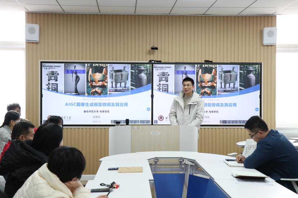 副教授侯西龙以“AIGC图像生成模型微调及其应用”为题,系统阐述了AIGC的发展现状,解析了国内外开源图像生成模型的使用方式、稳定扩散模型的微调等技术,剖析了当前生成式人工智能领域中图像生成技术的最新进展与团队研究案例,并通过青铜器文物图像智能生成技术应用的创新案例,分享了AIGC技术在赋能文化遗产活化与辅助文物修复等方面的研究创新。与会教师就AIGC技术如何变革课程建设、教育资源开发、数字媒体创作范式、AI如何融入教学实验与教学活动等专题展开热烈讨论。