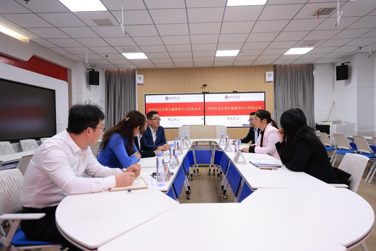 刘波详细介绍了学院专业和学科的建设进展以及毕业生就业等相关信息,他期望双方能在虚拟实验室建设、实习实践等领域深化研究与合作,同时在宣传推广和人才培养方面开展更深入的探索。王西辉对东港区融媒体中心的建设情况进行了讲解,着重强调了乡村振兴、打造爆款产品以及挖掘优质文旅资源的重要性,并指出高校与政府、企业在融媒体领域存在广阔的深度合作潜力。同时,她表示融媒体中心将积极为毕业生搭建实践平台、提供就业机会,助力学生提升专业能力与实际操作技能。双方还围绕短视频、网络直播、动画制作、新媒体运营以及文创衍生品创作等方面展开了探讨。