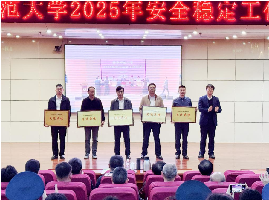 在图书馆报告厅召开2025年度安全稳定工作会议,旨在系统总结过去一年校园安全工作,表彰在安全管理中表现突出的单位和个人,学校党委书记邢光在会上讲话,党委副书记、校长张洪海主持会议,学校党委领导班子成员李志红、胡凡刚、刘刚、陈刚、陈丙波、李登旺出席会议。