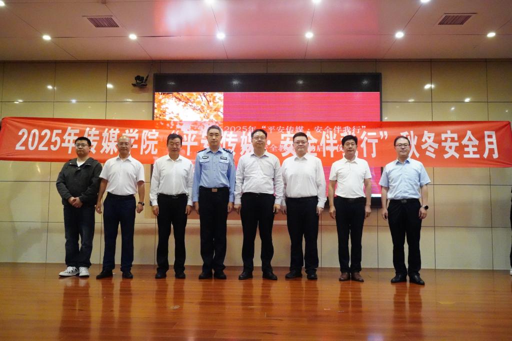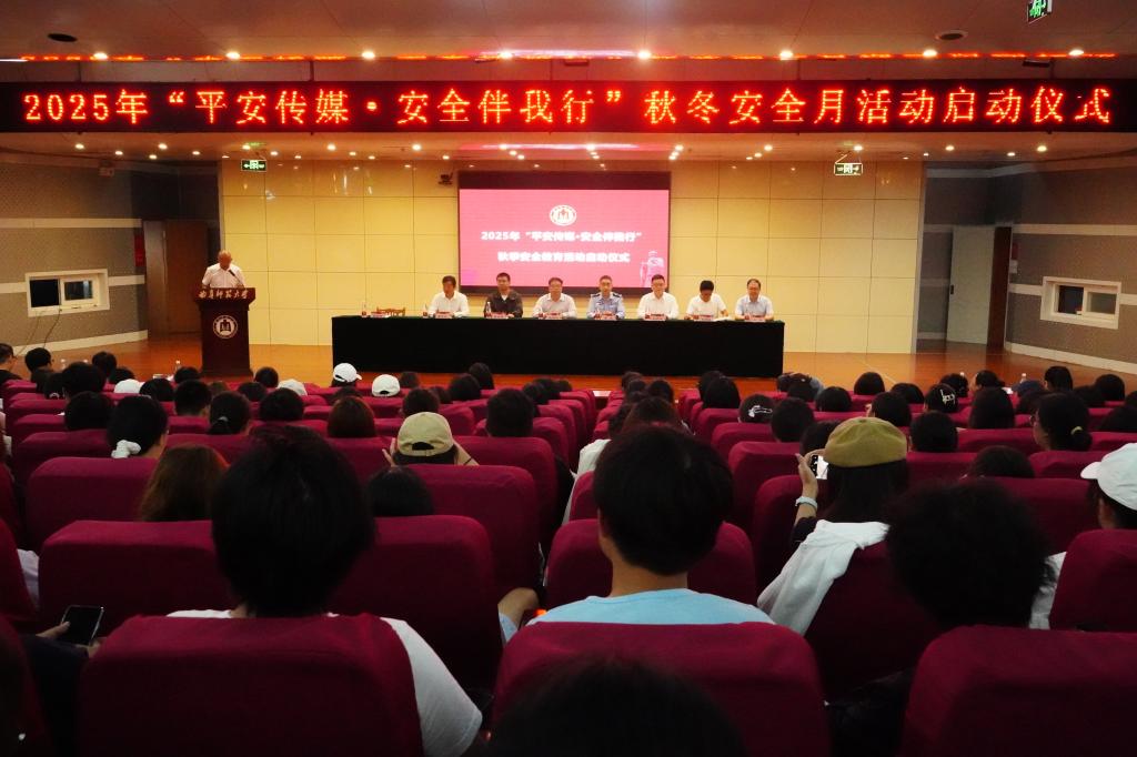 举行2025年“平安传媒·安全伴我行”秋冬安全教育活动启动仪式。日照市公安局东港分局秦楼派出所副所长陈磊、日照市心脏病医院医师戴启睿、日照校区党委副书记刘天浩、保卫处副处长王光江、学生工作处(武装部)副部长赵秀臣、教务处副处长孔峰、老虎机