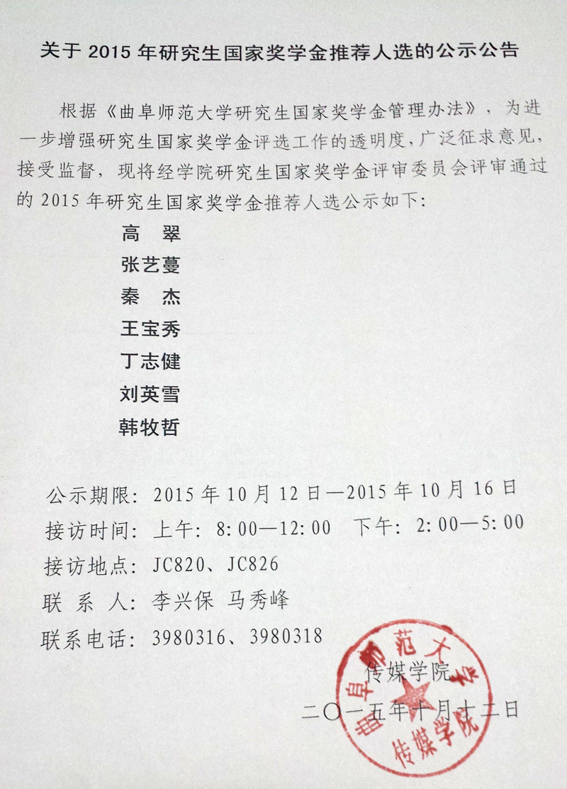 【来源:2015年研究生国家奖学金推荐人选公示 | 发布日期:2015-10-12 】