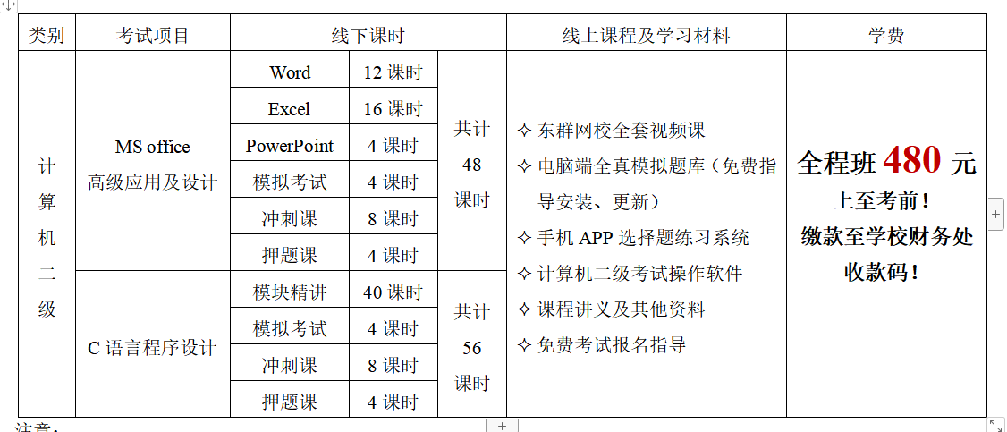 校内东群教育计算机二级培训内容及收费标准公示如下:
