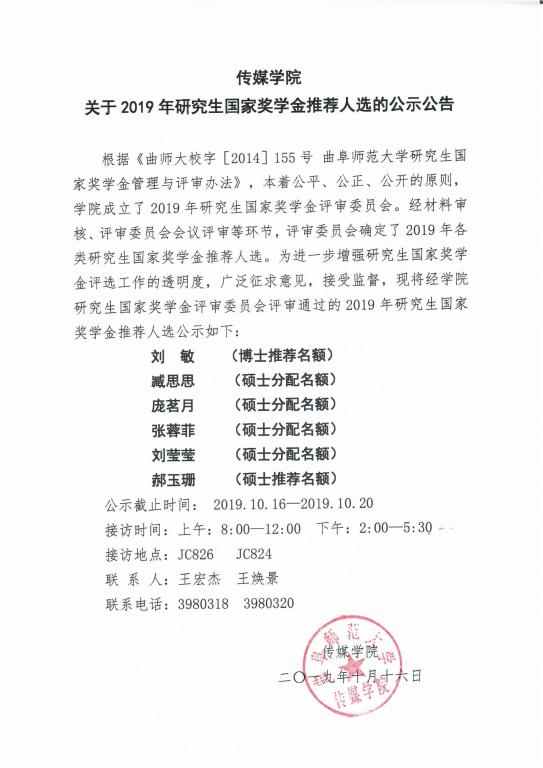 老虎机 关于2019年研究生国家奖学金推荐人选的公示公告
