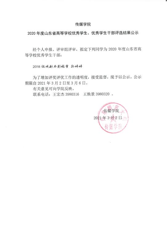 老虎机 2020年度山东省高等学校优秀学生、优秀学生干部评选结果公示