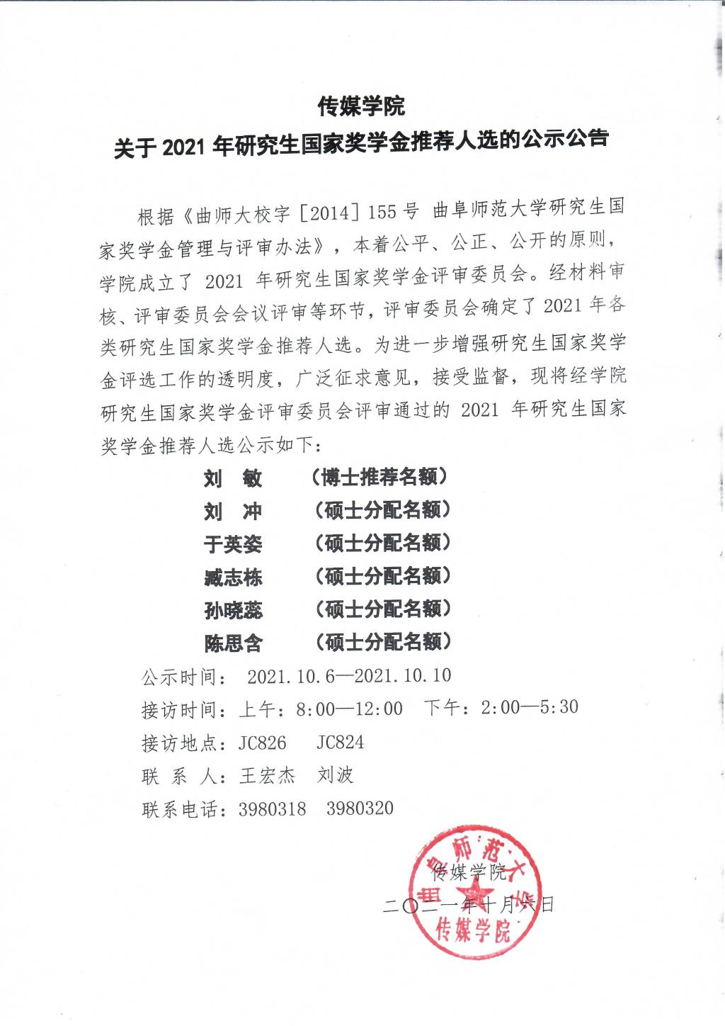 老虎机 关于2021年研究生国家奖学金推荐人选的公示公告